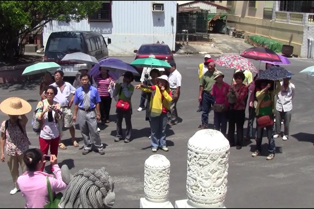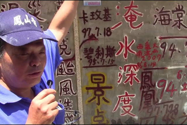 燄塭村萬壽宮前,解說志工描述當時淹水的高度。 面對一批一批進來的遊客,在地居民很樂意與遊客分享災難的當時。