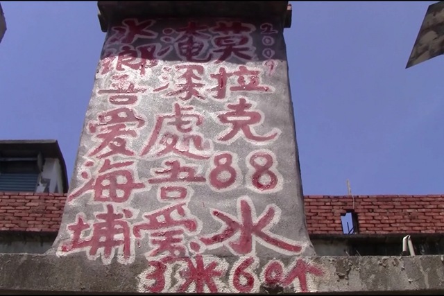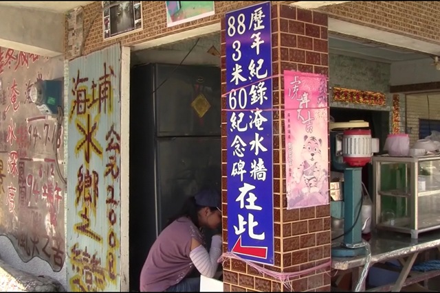佳冬居民周金明在屋頂立了一塊水泥石碑「八八水災紀念碑」記載八八水災的高度,3米60 ,成為觀光熱門景點。
