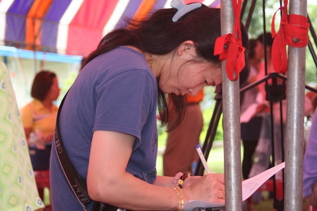 組合屋前的廣場上,有些村民專心聆聽,有些人則默默書寫表格。眾多親屬的珍貴生命在此刻成為法律上的計算公式,廣場上的氣氛在吵雜中帶著幾分凝重。