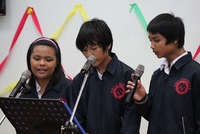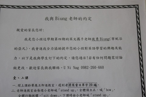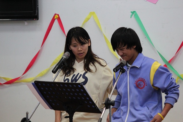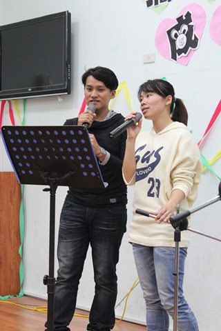 每一位學生輪流上台以英文自我介紹,用英文背誦出「Twinkle, Twinkle, Little Star」,唱著英文歌曲,雖然面對麥克風,面對台下的觀眾,看來有些緊張,有些恐懼,但在Biung老師的鼓勵下,學生們還是能將歌詞唱出。