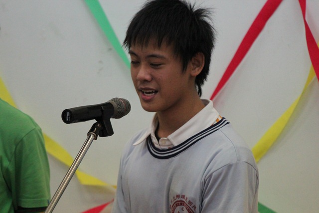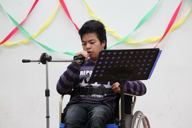 攜手計畫中的Phil,以及佩君老師所帶的資源班中的明華,在身體上都有些不便,但在成果展這天,他們對著麥克風,一字一句清楚地唱出英文、中文歌詞。
