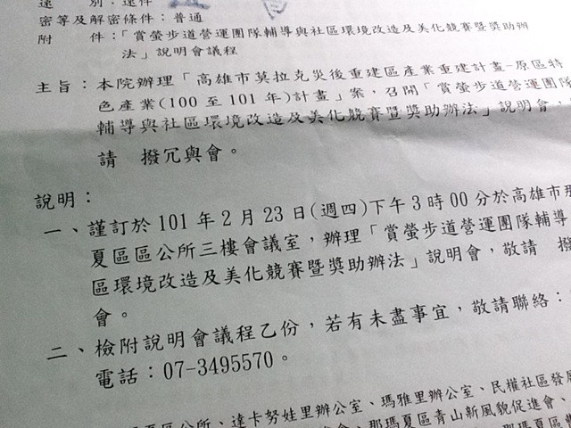 「台灣發展研究院所推動的「賞螢步道營運團隊輔導與社區環境改造及美化競賽暨獎助辦法」說明會議程在2月23日於高雄市那瑪夏區舉辦。此次的會議說明多數族人表示,沒做相關的調查就說要執行賞螢步道計畫,對於這個突如其來的賞螢步道計畫,那瑪夏族人持質疑態度……..