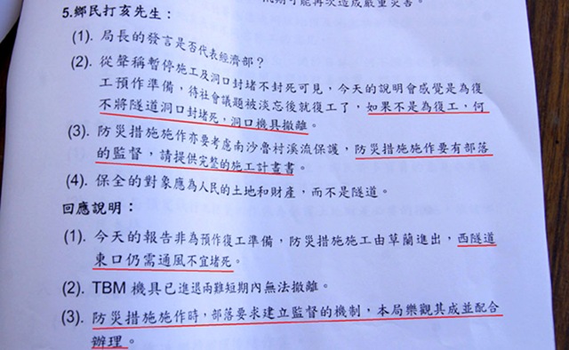 對此,承包廠商大成工程處長賴瑞琪出面解釋,現正進行的工程為已鑽炸隧道的保護及防災工程,並非復工。但南沙魯里長李惠民認為,水利署及施工單位對於越域引水工程如何處置,從未告知當地居民,「這麼大的災難這些人命,但是到今天,連我們住在這裡最近的人,都還不知道你們在那裏面做些什麼!」