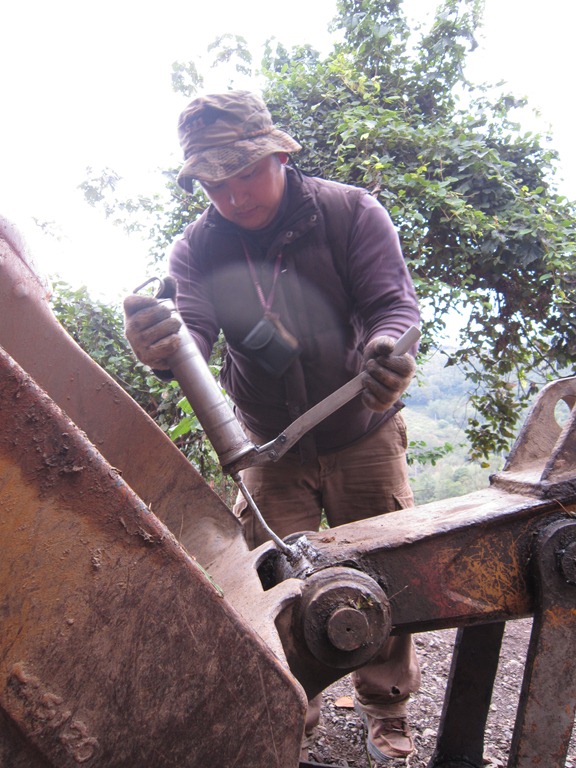 怪手就在兩天前整理進度處待命。抵達怪手處,Andrew的第一個動作是保養,怪手渾身上下有20-30個鎖螺絲的孔點,必需一個一個地上黃油潤滑,避免等一下開工後出狀況。畢竟,一個人在荒山中作業,獨自面對落石土滑的風險,怪手的狀態穩定,是唯一的安全依靠。「才十幾萬的工程,不會有錢作防護,又要搶快。工程最怕搶快,搶快就容易出事」,一邊耐性地為數不清的孔點一個個上油,Andrew有感而發。