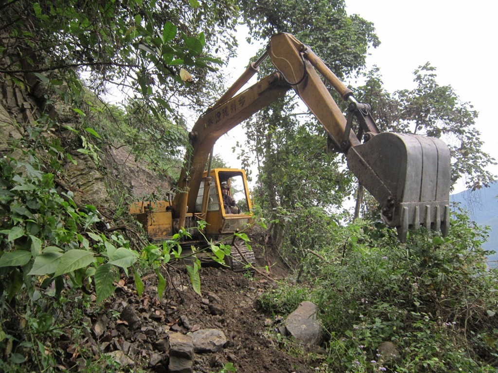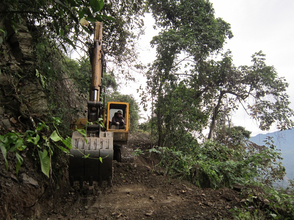 完成一段小坍方,Andrew的怪手一路前行,沿著大半年沒有車壓過的既有路線進行清開落石、壓平路面、確認路基寬度等簡單作業;山徑是Z字型在山體上蜿蜒,等走到剛剛清理坍方路面的下方,我們見識到一片崩壁,路基已經整段消失!