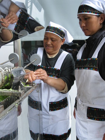 (左) 梅子要脫毛、榨汁才能熬成梅精。勤和的處理機器還未就定位,擔任勤和梅加工課程老師的吳老闆,大方出借自己的機器。婦女認真學習使用方式。(右) 榨汁機分離出來的梅核,有婦女帶回去,試著做成枕頭和裝飾品。