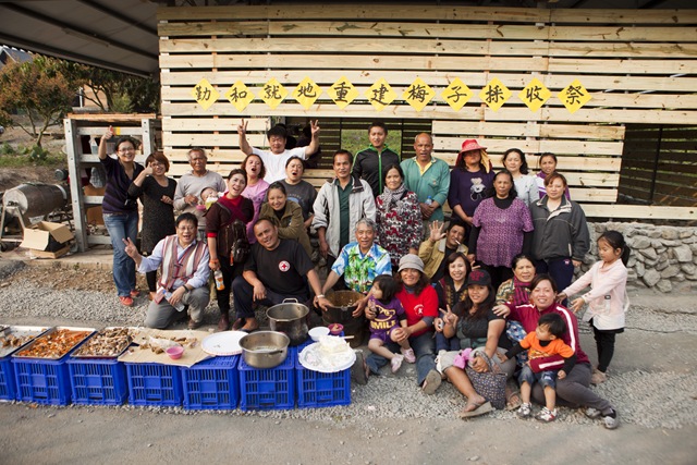 3/19勤和平台上就地重建協會的成員們舉辦了梅子採收季與三月壽星慶生會。後方為居民Dahu提供自己的工寮給協會,改建成梅子加工的工作坊。(圖片提供 /台灣農村陣線 光頭)