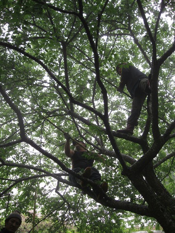 在公田打梅子。協會協調出一塊「公田」,加工梅子都來自於此。攀高援低的體力活,從小與梅樹為伍的族人駕輕就熟。雖然辛苦,但比起需要小心翼翼、精於計算的加工流程,是更令大家放鬆自在的工作。