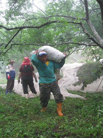 收集青梅、裝袋、以自製簡易器材篩去樹葉,慣於集體勞動的族人很有默契的分工合作著。