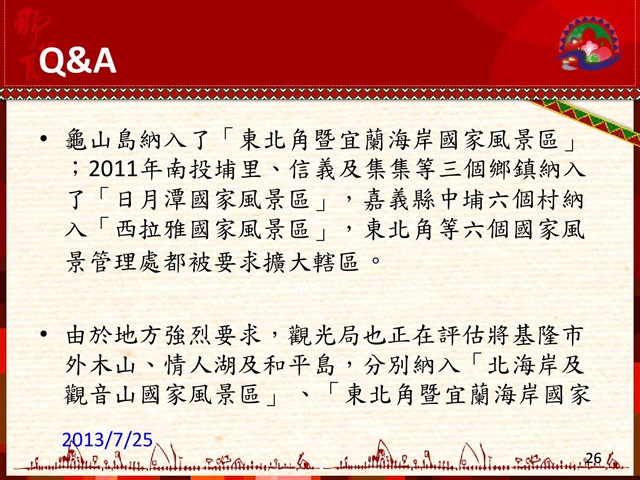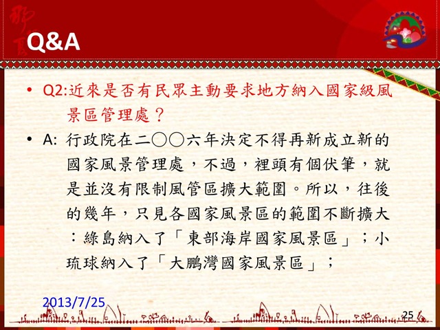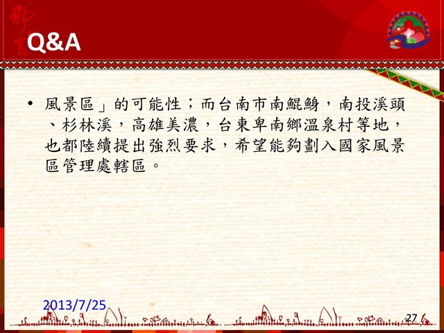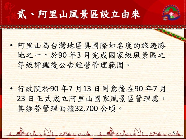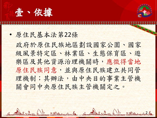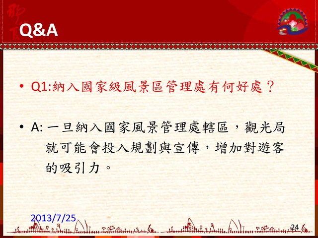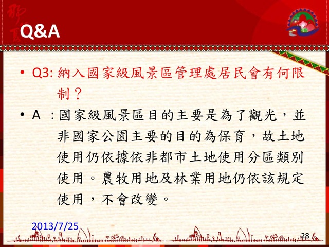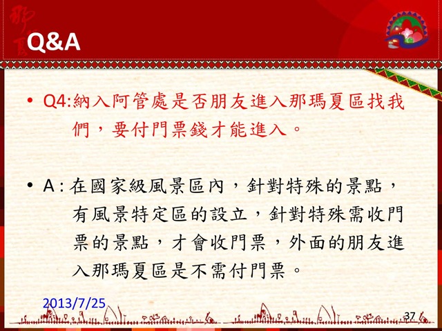 農業課課長何正品過去曾在玉山國家公園管理處服務,他向居民說明加入阿管處的優缺點,並表示,《原基法》規定若要設定國家風景區、林業區等,應徵得當地原住民族同意並建立共管機制,「接下來的話就是用電話訪問或者是意願調查的方式凝聚共識,但就算到了這個過程,我們還必須向交通部觀光局提出我們的優缺點,看他們願不願意我們加入,我們加入的話並不是由他們主導,彼此之間還要形成共管機制,類似是一個會議大家來討論是不是共同的方向,並不會單獨由阿管處來主導。」