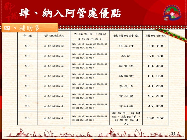 5.阿里山區公所有個大問題是,大部分的經費用於人事及補助就近7-8成了,還能夠多做什麼?跟農委會900億預算,有800億作為補助金有異曲同工之妙,不知那瑪夏情形如何?
