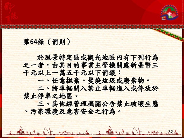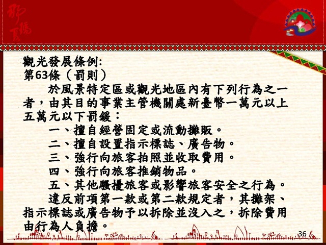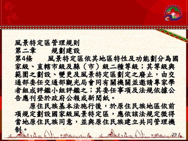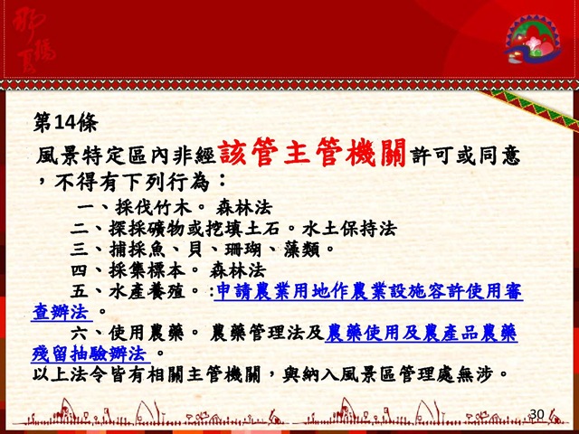 《發展觀光條例》第14條提到:「主管機關對於發展觀光產業建設所需之公共設施用地,得依法申請徵收私有土地或撥用公有土地」;第17條提到:「為維護風景特定區內自然及文化資源之完整,在該區域內之任何設施計畫,均應徵得該管主管機關之同意。」