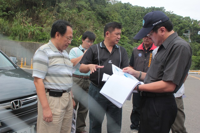 左立者為高雄市政府工務局新建工程處副處長,中立者是那瑪夏Bayan區長,右立者為南水局主任工程司室鄒漢貴。站在原定要集合會勘的台20線與南179縣道會合處,大家就地討論了起來。