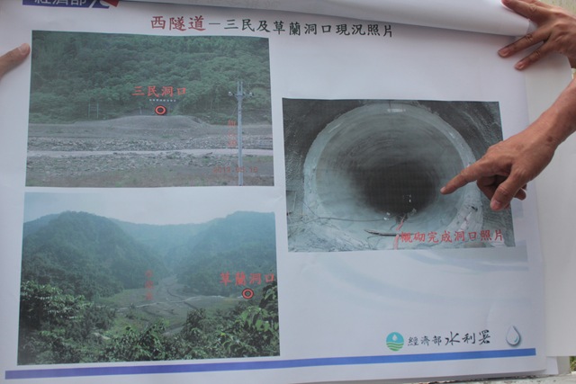 南水局主任工程司室鄒漢貴:「西引水隧道從三民(民族)洞口到草蘭洞口段,目前正在做襯砌工程,預定完工日期是104年6月份;因為原設計目的為走水通路,所以內部是圓形的,只有4.5米寬,無法提供雙向行車,只能單向通行;全長4.3米,沒有排氣通風設施,也沒有照明設備。八八風災將河床抬高四、五十公尺之後,目前三民洞口與楠梓仙河床仍有落差4公尺,沒有過河結構物;另外草蘭洞口引道工程/橋屢屢雨後會被水沖掉;所以目前西引水隧道兩端出口均沒有引道。