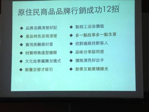 而麒策品牌顧問有限公司執行顧問蔡明宏所帶來的「打造原住民品牌三部曲:從業務拓展到品牌行銷的建立」的分享,給族人應象最深刻的則是原住民商品品牌行銷成功12招。