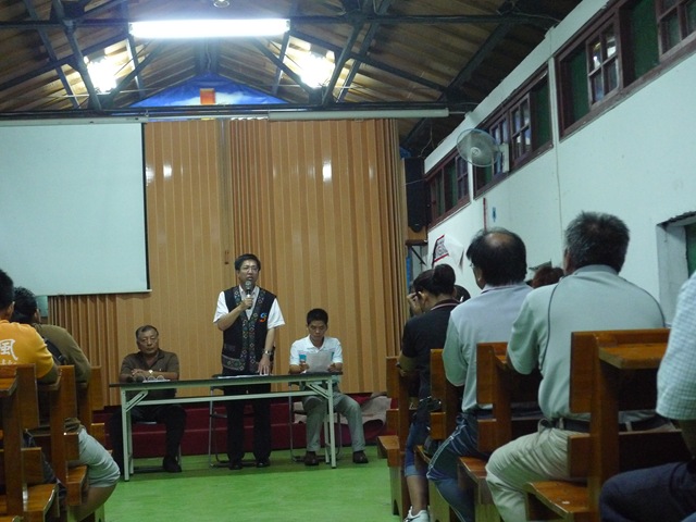 面對部落族人由左至右之與會人員,好茶村長陳保華,重建會副執行長陳振川,屏東縣政府原民處副處長蔡文進。