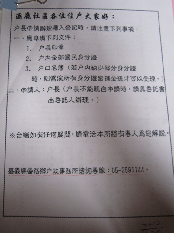 阿里山鄉各村村長都有收到的通知單,要求各戶戶長備妥證件逕向番路鄉戶政事務所辦理遷入。