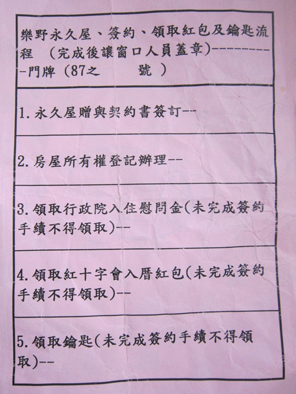 12月1日樂野永久屋入住時的流程。縣府陳秘書說,沒有遷戶籍,一樣可以拿鑰匙,只是不能拿所有權證書,也不能拿搬遷費。不知屆時在這樣的流程下,是否第二項到第四項的權益都沒有呢?