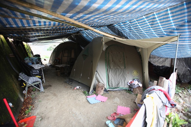 村中仍留有安置災民的2頂帳棚,但據村民指出,受災戶並不是經常來住,帳棚外也已結上大大的蛛網
