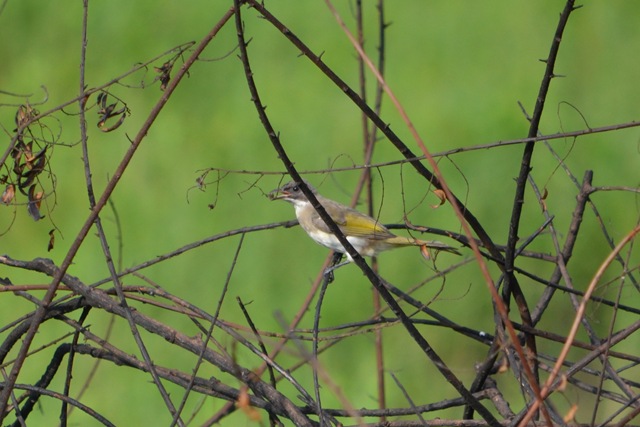 鐵道旁:林邊鄉生活美學會培力員許玉佩特別自豪這張相片,她回憶拍這張照片的情景,為了等候鳥類她已蹲在草地內等候多時,突然發現牠正在吃果子。「好小的一隻鳥,很少見的種類,牠大概只是路過的候鳥吧。」許玉佩說。許玉佩提供