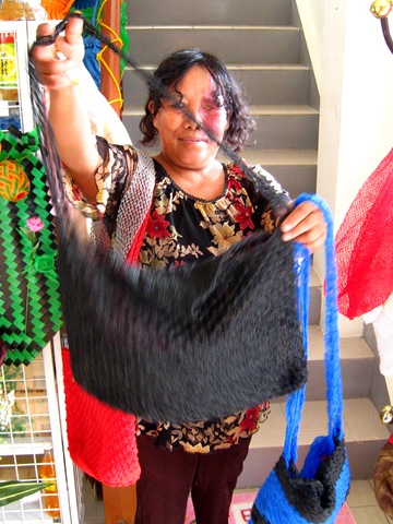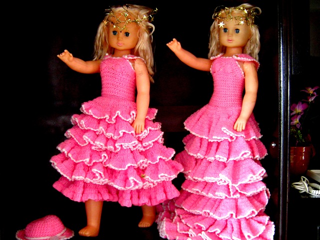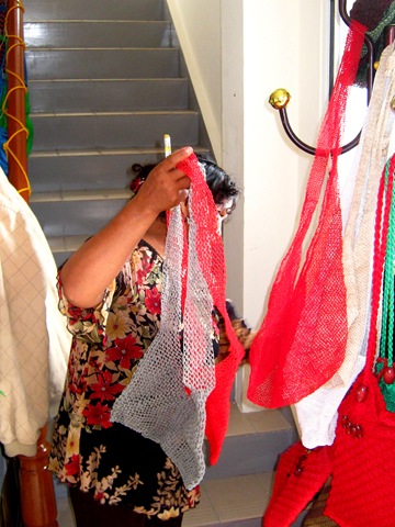 Lubula指著自己家中的提籃、編織包,害羞地說著,「這些都是我利用晚上沒有工作的時候,一邊看電視一邊做的。」從岡山帶回來的二手電視櫃,上頭還擺著兩尊洋娃娃,洋娃娃身上的禮服,是Lubula一針針勾織的,她說:「那時候我在南投工作,遊客到我們的工寮看到,還請我去埔里酒廠、信義鄉教他們怎麼做。」