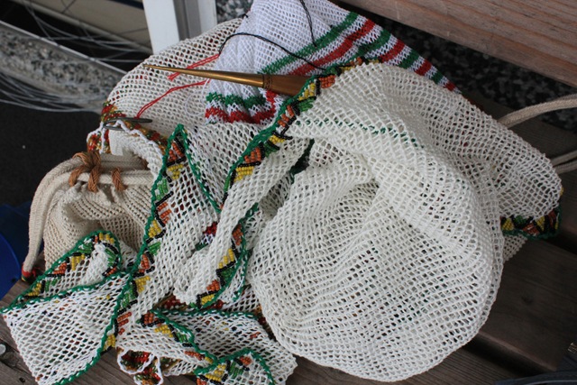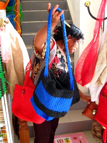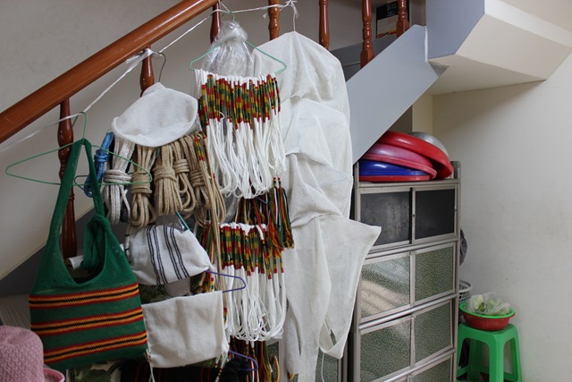 走進幾個正在做手工藝的Umu、Kaingu家中,老人家忙碌的身影後,是擺放著傳統服飾的櫃子,櫃子上還擺了乏人問津的月桃編、竹編、藤編的籃子,當然,也少不了幾乎每個部落婦女都會作的打包帶編織籃,就著家門口的手把,谷川部落的李阿桃Kaingu把棉線勾在手把上,拿著羊角勾,一上一下、鬆繩拉線之間,揹袋逐漸成形。