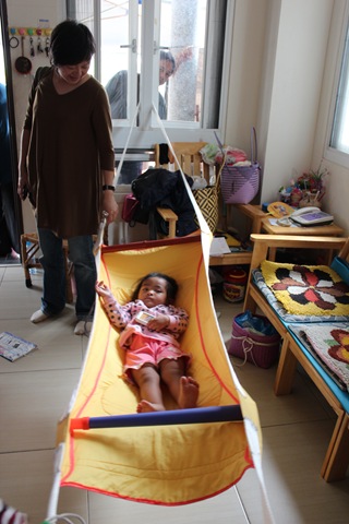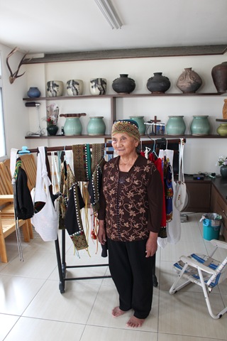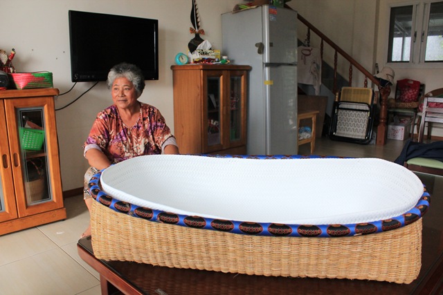 問她,作手工藝的收入如何,Kaingu說,得有人訂才有銷路,拿出有人訂購的搖籃,她說:「我們以前工作就是這樣揹,因為沒有辦法一邊照顧孩子一邊吃飯,所以就揹在頭上,搖小孩子,如果天氣比較冷,這個外面還可以蓋一件小棉被喔!」