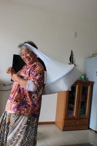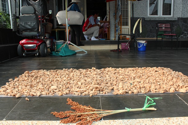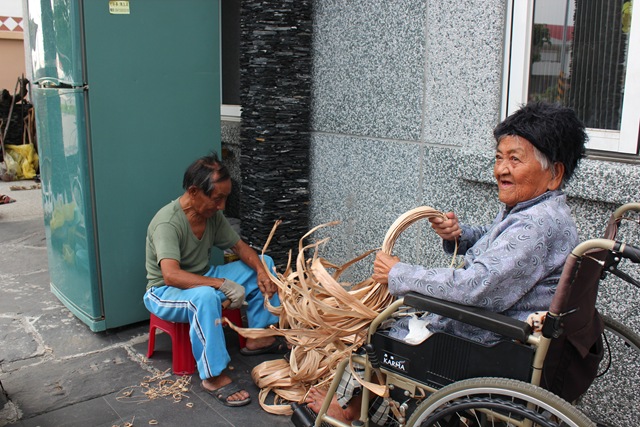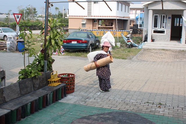 往德文、達來居住的區塊走,達來的頭目夫妻正在整理著月桃葉,老人家從種月桃、採月桃、整理月桃都靠著自己的雙手完成。