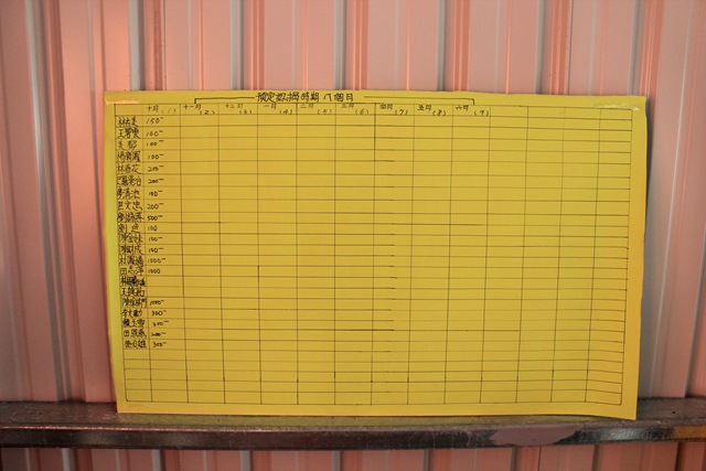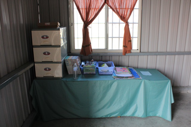 在鐵皮屋的牆角,一邊擺放著主日學的孩子們會用到的故事書、彩色筆,另一側的牆上,則貼著一張認捐的統計表,林梅蘭提到,由於是新建的教會,也有基金會捐助教會的建堂費用,但教會仍缺鋼琴、投影機、攜帶式麥克風以及電腦設備,