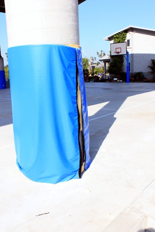 加上防撞海綿的柱子,僅用魔鬼氈固定的帆布已被打開,地上則有散落的海綿