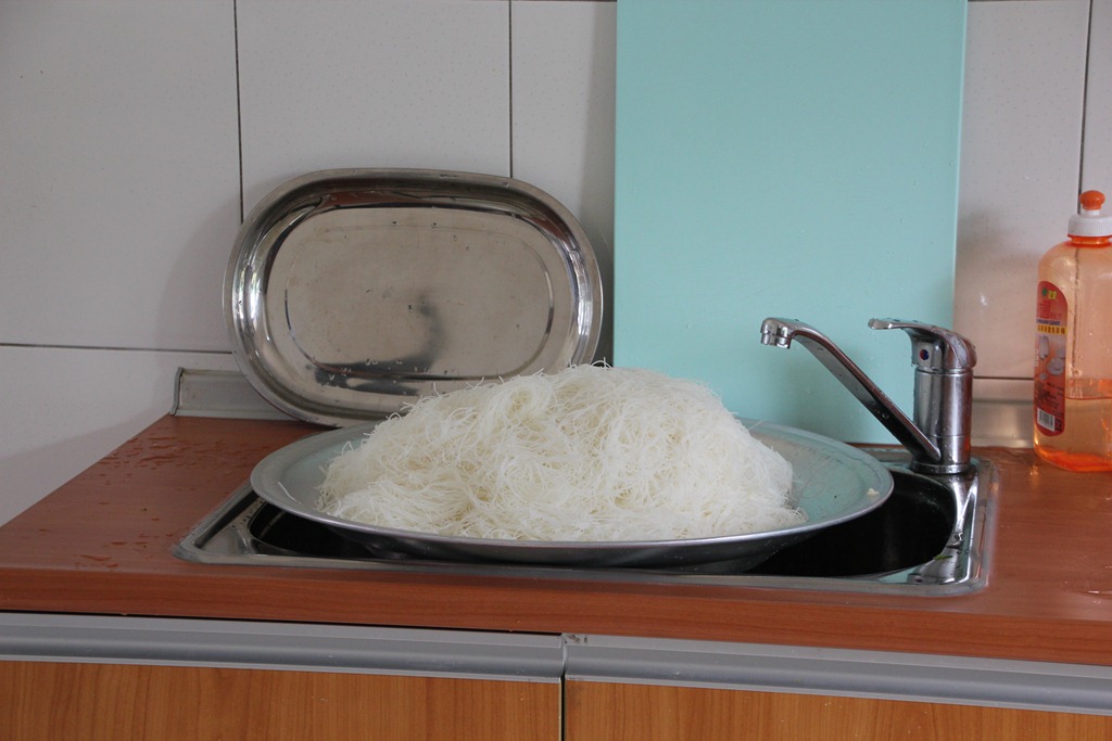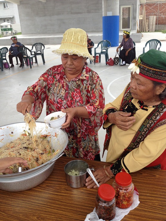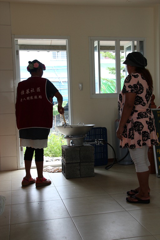 這天上午,志工們「按照慣例」,在佳暮社區發展協會辦公室裡烹煮要提供給長輩享用的午餐,大鍋子裡煮著蔬菜粥,洗手台上,倒放的鍋蓋則「物盡其用」地放置著待會兒要炒的米粉,幾個婦女你一言我一語地告訴記者:「這個是我去跟隔壁借的。」、「上次我們也藉蒸籠,剛剛才拿去還人家而已。」、「只有一個鍋子可以炒菜,所以要這樣先煮好粥、米粉先用鍋蓋裝著。」