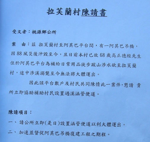 一年多以來,拉芙蘭村民多次向鄉公所反應,還有人居住在這個小部落,希望公所修築一條涵管便橋供族人通行,鄉長皆以「鄉公所沒錢」回應,不了了之。今年五月中汛期開始之後,阿其巴的對外道路可說幾乎沒有通行過。