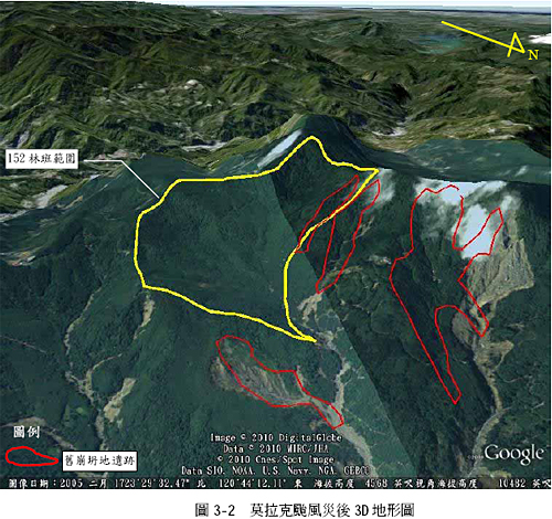 (圖說:據太乙工程顧問公司評估報告顯示,152林班地為集水區上游崩積岩塊堆積層,且有豪雨沖蝕溝谷形成,應避免引進人口居住。然而,該評估報告同時也指出,152東側有鞍部地形,下邊坡又有多處平緩台地,,不但林相完整,也沒有表面滑動現象,若進行必要水土保持工程,或有機會成為「相對安全之聚落安遷基地」。欲在此地進行補強工程,嘉義縣政府勢必得付出較為高昂代價;為災民建造一個「永久」的聚落地點,究竟要付出多少金額才是合理的呢?太乙工程顧問公司提供)