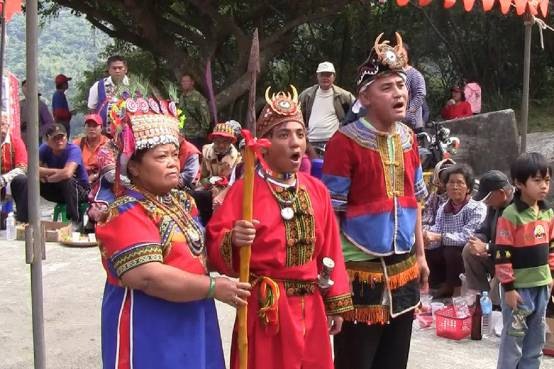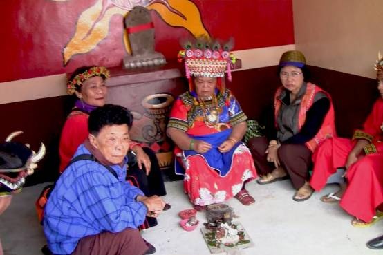 除夕迎祖靈是高士部落的傳統祭儀,巫婆、祭師及頭目(由左至右)在祖靈廟前呼召祖靈。