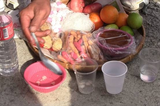 (左)各家族都準備著祭品在祖靈廟外,等著迎接祖先回家過年。(右)準備的祭品與平地人過年祭祖的供品類似
