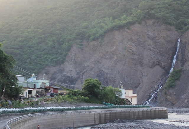 東部落後方。民眾說,「現在堤防只有做一米二不夠啦,至少要兩米。」因為堤防低,大水有時也會從堤防處淹上民宅和馬路。這波豪大雨之後,水保局趁著雨勢稍歇前來堆上沙包,希望可以暫時擋一擋下一波颱風。但村民覺得不樂觀。![]()