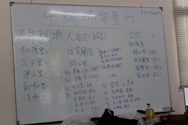 牛稠埔營區中,桃源區公所臨時辦公室的白板上,紀錄在營人數、住院人員以及留在孤島效應的各里人數,其中「勤和里42人」是6月26日勤和里族人25人結束營區安置返鄉之前的留守人數,公所人員忘了更新。