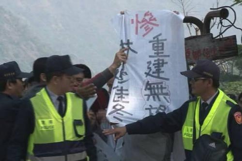 本月25日瑪家農場永久屋落成典禮,馬英九總統受邀參加,而一群來自林邊鄉、佳冬鄉重災區的鄉親,為了日前政府太陽光電躉售政策大轉彎的事件,在場外舉著白布條向馬總統陳情,但被優勢警力阻隔。
