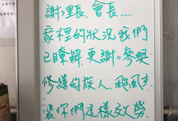 今天是輕颱泰莉接近台灣發布海上警報的第一天,不論在山上還是山下的族人,都不免擔心;接下來的考驗,是今夜的豪大雨,在營區中,大家一邊看電視一邊說,「下大雨囉」,心裡都是懷著對親人安全掛念。