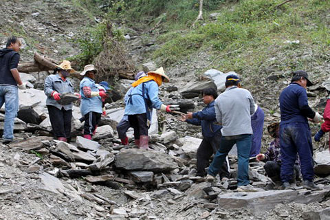 示範屋的主結構已蓋的差不多了,為了呈現排灣族的傳統建築樣式,外牆要砌石牆,有一部份村民回到山上撿拾石板,不分男女都爬到峭壁上,從下方看著依娜們往上攀爬,雖然身上帶著游泳圈......但還是非常的靈活哦。