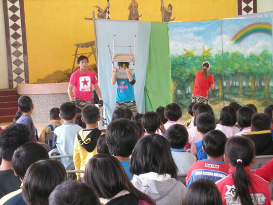 「望、聞、看、查」,紙風車劇團以簡單的背景,誇張趣味的表演方式,將如何防預防土石流災害的口訣以RAP的方式,讓每個孩子都能輕易的熟記,連一旁的家長老師也看的津津有味。