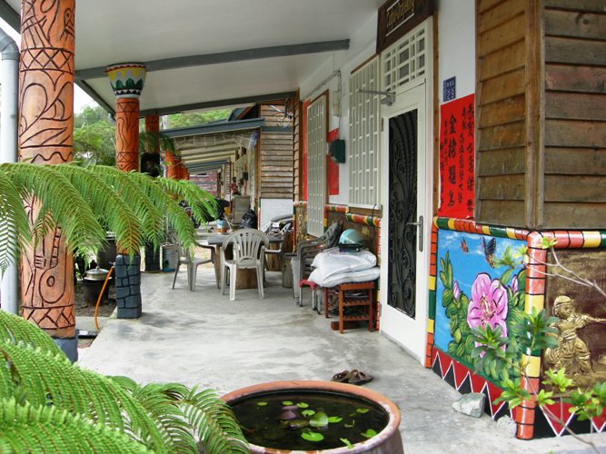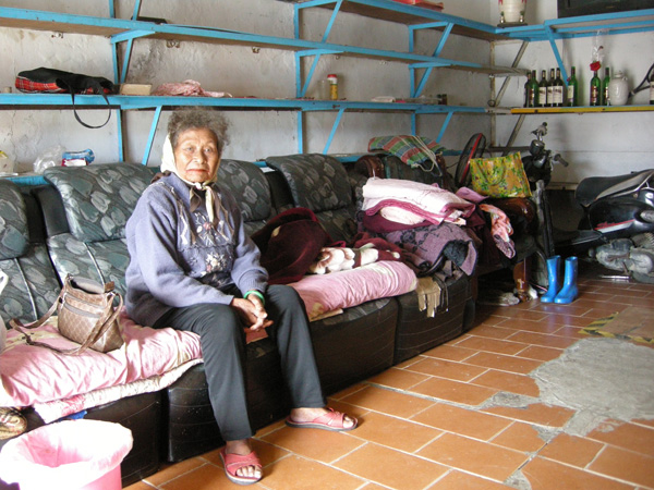 沙發上堆疊著被褥,李金花解釋這是她現在睡覺的地方,因為整個住宅的後半部已經陷落超過一米,廚房不能使用,vuvu乾脆把自己的起居間改成臨時廚房、客廳當成臥室。每晚睡在很難翻身的沙發椅上,vuvu只是笑笑說:「我不敢睡在後面啊,睡這裡比較安全啦!」