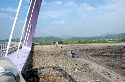 聽著爾克比劃著那裡是停車場、民宿區、吊橋...望著空空如也的河床,怎麼也難想像,以前抬頭看山很高很遠,現在很近,因為河床被墊高了近百米高!他說:只有熟悉這裡的人才能體會,第一時間看溫泉區瞬間消失被淹沒...