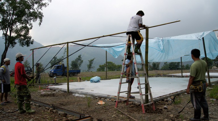 南沙魯避難屋在4月動工,三個月後只完成兩棟房舍地基的灌漿作業,台21線逢雨就斷,工程進度大幅落後,颱風季已開始,南沙魯居民仍無避難之處。