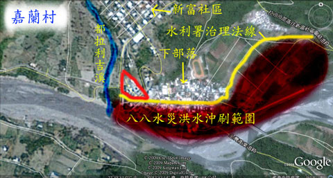 嘉蘭部落與富山部落一樣,對「原居地不安全」及遷村有共識,因此今日的「特定區域」劃設順利的進行,但其中有一個區域,居民沒有同意,目前就尚未劃入危險區域中。