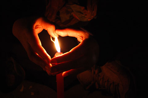 災後至今100天。從14日晚間到15日清晨,受災的原住民在高雄縣鳳凌廣場跨夜靜坐燭光祈福晚會,這個晚上,有災民,也有外界關注的朋友,點燭光,紀念這段沒有山上可以回家的日子。